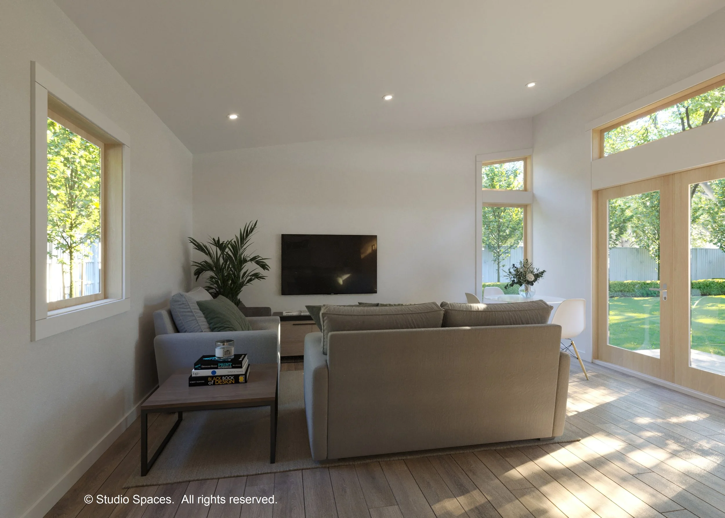 Our standard interior package includes: Insulation, drywall, laminate flooring, trim, HVAC (mini split system), plumbing & plumbing fixtures, electrical & lighting fixtures, kitchen & bath cabinets including counter tops and appliances.
